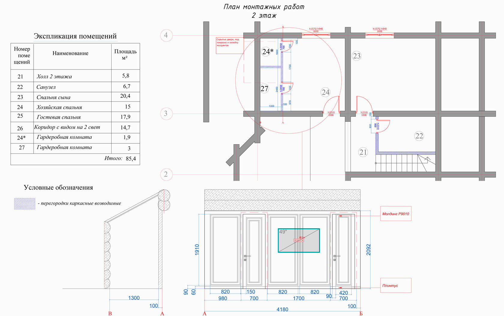 Включает в себя чертежи для выполнения отделки, электрики, сантехники, разрезы и развертки помещений. Они учитывают все особенности проекта, для точного выполнения задуманного концепта